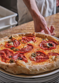 Im Holzofen gebackene Pizza mit knusprigem Rand und feinem Raucharoma trifft auf frisch zubereitete Pasta mit aromatischen Saucen und ausgewählte Meeresfrüchte von höchster Qualität.